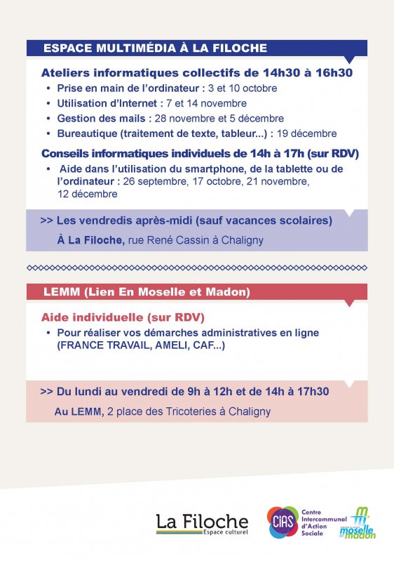 - A l'espace multimédia de la Filoche pour participer à des ateliers informatiques collectifs ou pour bénéficier de conseils informatiques individuels.